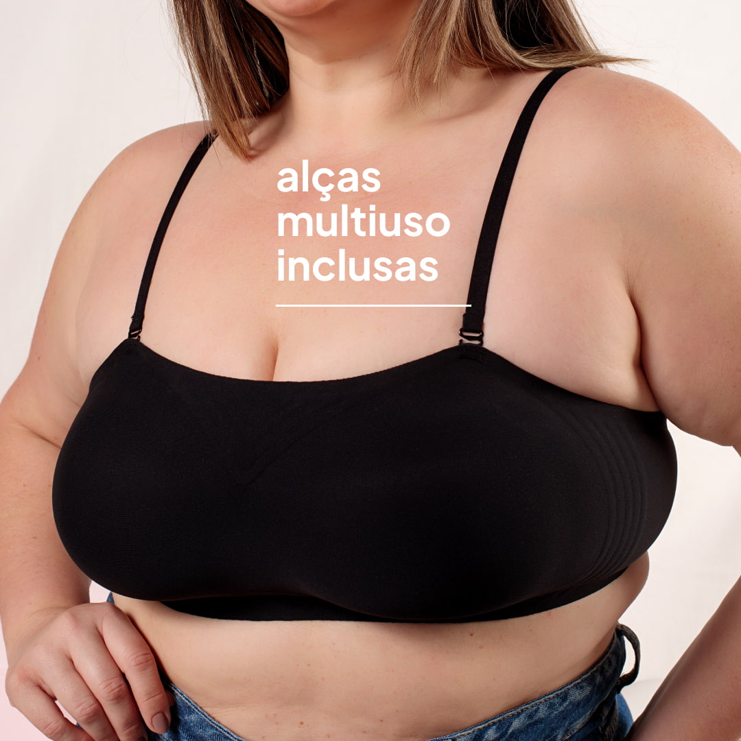 Um sutiã sem alças com sustentação segura, formato anatômico, faixas de silicone que são antideslizantes. Ele possui alças para adicionar, mais finas e compridas.